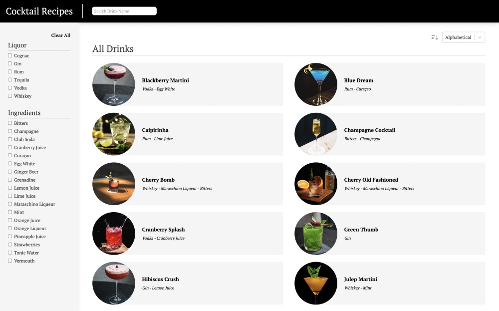A full-stack website for displaying cocktail images and instructions, letting users search, sort, and filter the menu to find a drink they’d like to make.